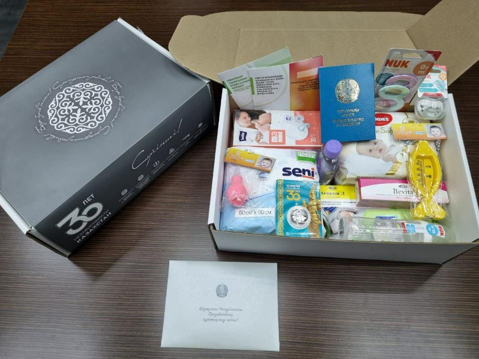 «Сүйінші» атты сыйлық жиынтығына бөбектерге қажетті заттардан басқа ҚР Президенті Қасым-Жомарт Тоқаевтың құттықтау тілегі жазылған хат пен «Тәуелсіз Қазақстанға 30 жыл» монетасы және баланың тууы туралы куәлігі салынған.